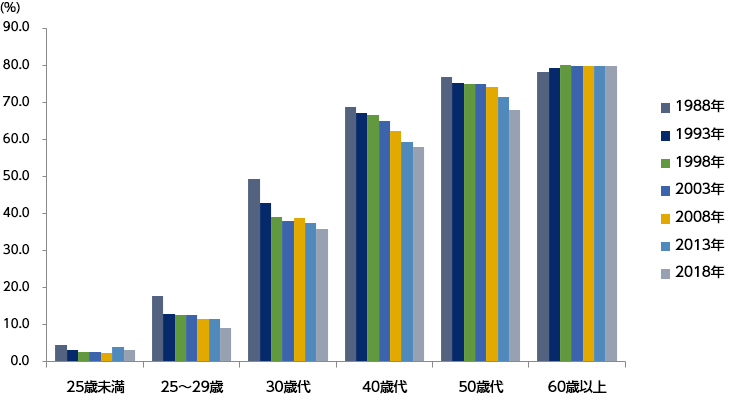 図1は、1988年から2018年まで(5年刻み)の30年間の年代別持ち家比率の推移を示しています。60代以上は概ね橫ばい、20代ではそもそも持ち家を所有する人が少ないのですが、こちらも概ね橫ばい。しかし、30代、40代、50代の持ち家比率が毎回減少していることが分かります。特に、40代50代は、明らかな右肩下がりの棒グラフになっています。