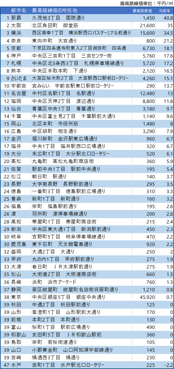 図は各都道府県別の最高価格地點の路線価を上昇率順に並べたものです。最も上昇したのは、沖縄県那覇市の國際通りの+40.8%。昨年の上昇率が39.2%でしたので、この2年間だけで路線価は2倍になりました。