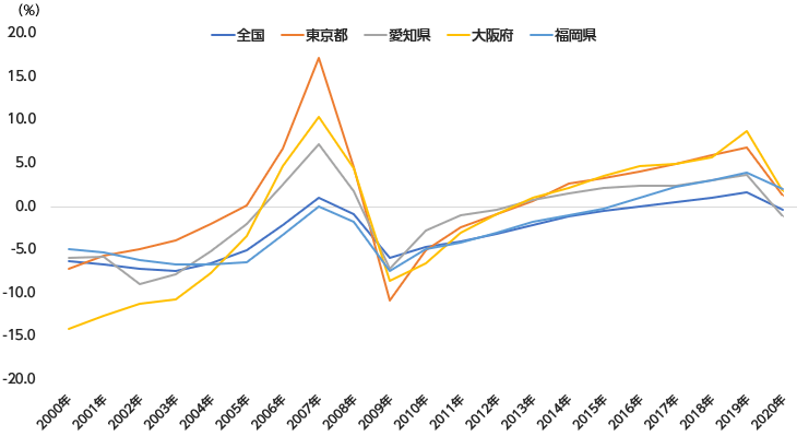 東京圏では-0.2%(前年+0.9%)、大阪圏-0.4%(前年+0.3%)、名古屋圏-0.7%(前年+1.0%)となっています。(國土交通省「令和2年都道府県地価調査」より)