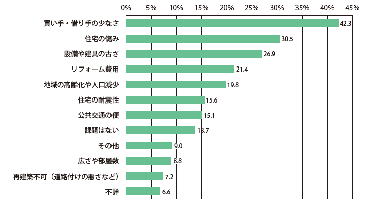 「賃貸」「売卻」の利用意向を持つ人に、賃貸?売卻するうえでの課題を聞くと、「買い手?借り手の少なさ(42.3%)」が最も大きくなっています。空き家の所在が、地方都市や郊外に多いためではないかと思われます。しかし最近では、郊外や地方でもさまざまな土地活用のパターンがあるため諦めずに多様な可能性について大和ハウス工業などの土地活用の専門家に相談してみるといいでしょう。
