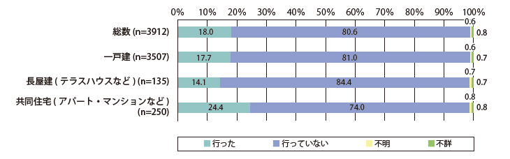 「建て方別の最近5年間のリフォーム工事の狀況」の結果を図5で見ると、全體では約18%の空き家物件で5年以內にリフォームが行われています。しかし、これを共同住宅(アパート?マンション)に限ってみれば、約24%と大きく上昇しており、他の建て方に比べて最も多くなっています。