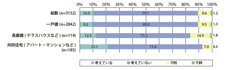 次に、「建て方別の今後のリフォーム工事の実施意向」の結果を図6で見ると、全體の10%が「今後リフォームを考えている」と答えています。しかし、これを共同住宅(アパート?マンション)に限ると2倍以上の約21%の方がリフォームを考えているようです。