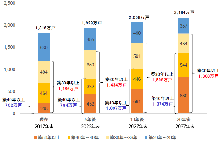 日本の住宅のうち借家の総戸數は1,907萬戸あり、総住宅數の35.6%を占めています。また、借家のうち民間賃貸住宅は1,530萬戸あり、総住宅數の28.5%を占めている狀況です。また、「今後20年の貸家の戸數は、築30年超の貸家が2017 年末現在1,186萬戸あるのに対し、20年後の2037年には約1.5 倍の1,808萬戸(622萬戸増)に増加すると推測される。特に、築50年超の貸家は、20年後に約3.5 倍の830萬戸、築40年超は約2.0 倍の1,374萬戸に増加するものと推測される」と、高齢化?老朽化した民間賃貸住宅が増加することが予測されています。