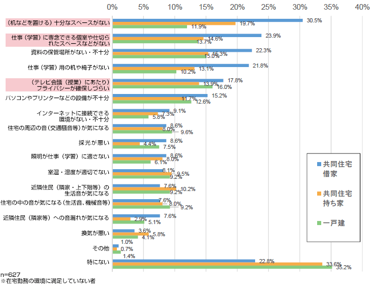 住生活基本計畫の立案時に參考にされたデータを見ても、「共同住宅では十分なスペースがないことに対する不満が最も高く、借家では約3割」となっています。今後、テレワークやオンライ