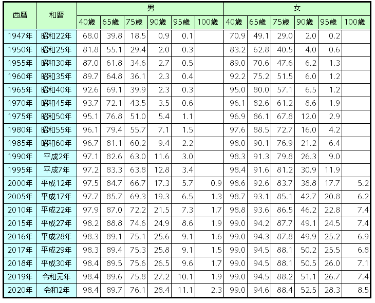 厚生労働省が公表した「令和2年簡易生命表」によると、65歳まで生存する方の割合が男