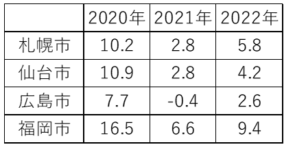 変動率の大きい順に並べると、金融緩和が進められた2013年以降では、2017年までは仙臺市と福岡市がほぼ並び、次いで札幌市→広島市となっていましたが、2020年以降は、札幌市と仙臺市がほぼ並んでいます。仙臺市については、上記のとおり東日本大震災の影響が少なからずあると思われます。