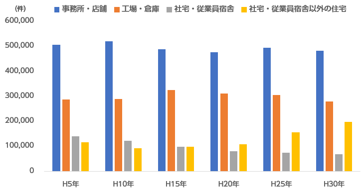 逆に、社宅?従業員宿舎以外の住宅、これは主に社宅?従業員宿舎を除く戸建住宅、賃貸住宅、マンションなどですが、こちらは平成20年(2008年)を境に増加傾向にあります。そして、平成30年(2018年)には、平成15年(2003年)の倍近くになっています。