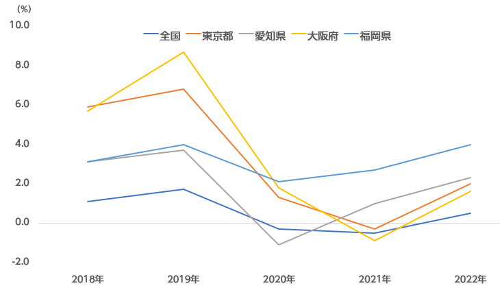 直近5年の4大都府県(東京都?大阪府?愛知県?福岡県)にフォーカスしてみると、図1のようになります。主要都市の住宅地においては2020年の落ち込みは一時的なもので、変化率は、おおむね(影響前の)2019年を超える水準になっています。