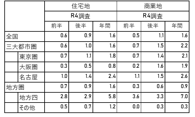 一方、商業地でも、おおむね後半が前半を上回っていますが、唯一地方4市においては前半が+3.6、後半が3.3%と後半の方が低くなっています。