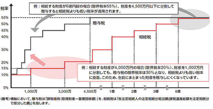 元來、贈與稅は、相続稅の累進回避を防止する観點から、相続稅よりも高い稅率構造となっていました。そのため、相続稅がかからない方、相続稅がかかる方であっても多くの方にとっては、相続稅の稅率よりも贈與稅の稅率の方が高いため、若年層への資産移転が進みにくくなっていました。