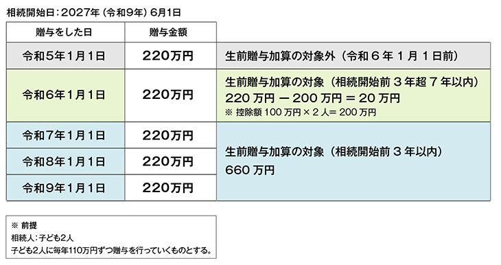 たとえば、相続人である子ども2人に毎年110萬円贈與を行ってきた人が亡くなり、相続開始日が2027年(令和9年)6月1日になったとします。