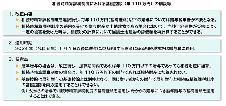今回の改正で相続時精算課稅制度に新たに「年110萬円の基礎控除」の枠が加わります。 2024年1月1以降、相続時精算課稅制度を選択した人への贈與でも、年110萬円までなら贈與稅が課稅されません。