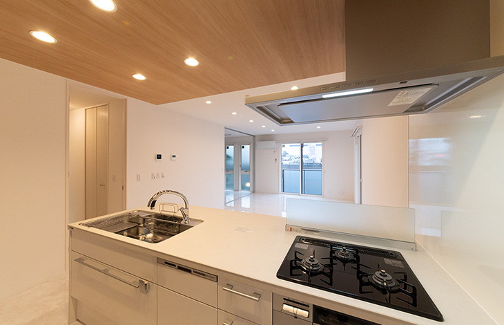 壁も白を基調としてとても清潔感があります。そして目に入るのは対面型のシステムキッチンです。
