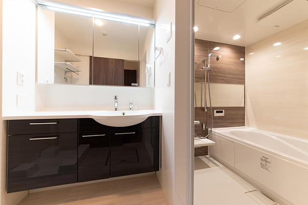 そして、1坪タイプのユニットバスや、朝の忙しい時間帯に二人でも使える洗面化粧臺は、戸建て住宅と同じレベルの充実した設備がそろっています。