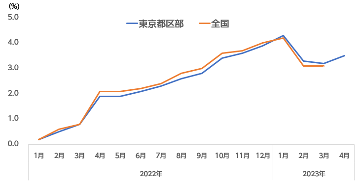 1つめのコアCPIの2%超えについては、例えば2023年4月28日に発表された東京都區部消費者物価指數(コア)は+3.5%と、すでに超えています。コアCPIについては、この先上昇率が鈍化することが予想されていますが、それでも2%前後は維持するものと思われます。