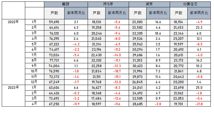 ?2023年4月の住宅著工戸數の「総計」は、東京都11,094戸、全國67,250戸で、どちらも3カ月連続でマイナスとなった
