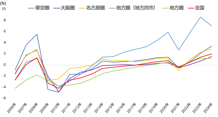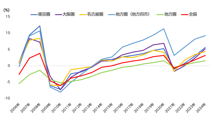 また、都市部ではオフィス回帰が進み、オフィス需要が伸び、店舗需要が回復していることや、三大都市圏や地方大都市での再開発事業が多く、この影響で利便性?繁華性が向上することの期待感から地価上昇が継続しています。