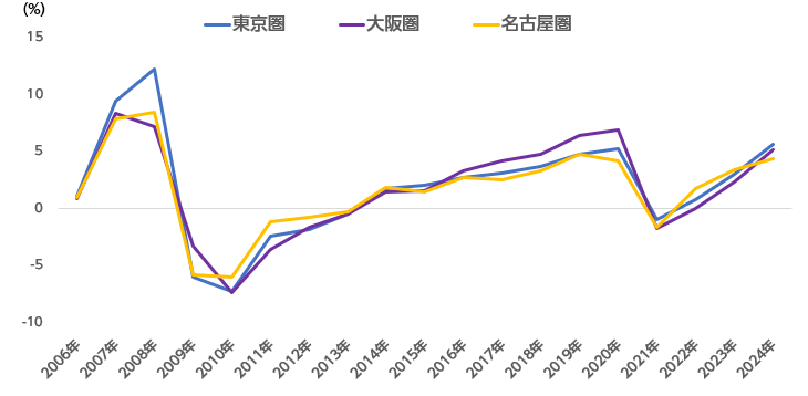 大阪圏(大阪府全域、兵庫県?京都府?奈良県の主要地域など)では、全用途平均で+2.4%(前年は+1.2%、前々年は+0.2%)、住宅地は+1.5%(前年は+0.7%、前々年は+0.1%)、商業地は+5.1%(前年は+2.3%、前々年は±0%)となりました。