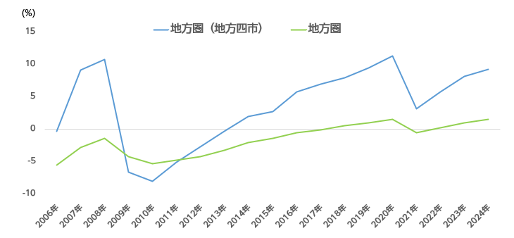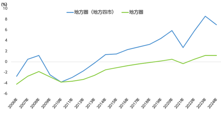 地方4市を除くその他の地方圏では、全用途平均は+0.7%(前年は+0.4%、前々年は-0.1%)、住宅地は+0.6%(前年は+0.4%、前々年は-0.6%)、商業地は+0.6%(前年は+0.1%、前々年は-0.5%)となりました。昨年、28年ぶりにプラス圏となったその他地方圏の住宅地が上昇幅を大きくしました。