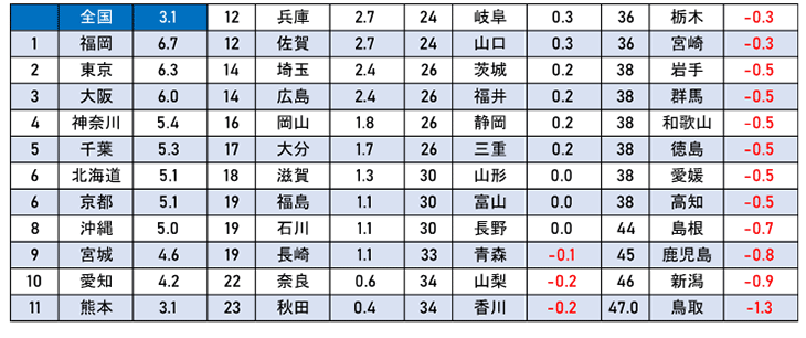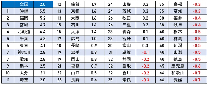 昨年まで3年連続して都道府県別で1位だった北海道は4位(+4.4%)になり、4年ぶりに沖縄県がトップに返り咲きました(+5.5%)。次に福岡県で5.2%、宮城県4.7%、北海道4.4%と続きます。