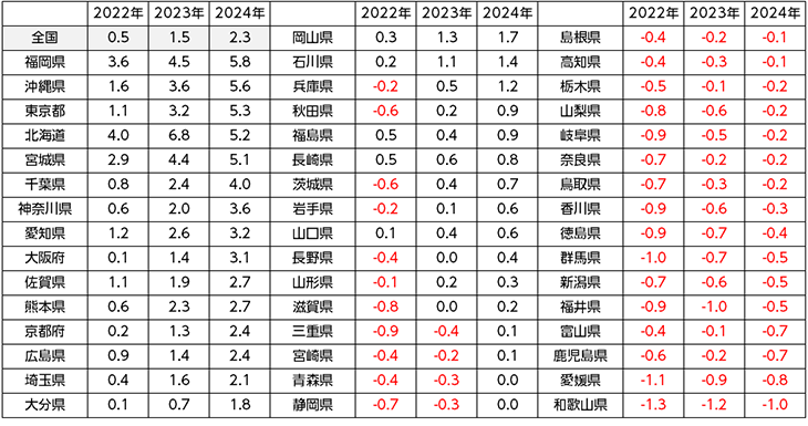 変動率をみれば、上昇率がトップだったのは福岡県で5.8%(前年は2位:4.5%)、2位は沖縄県5.6%(前年は4位:3.6%)、3位は東京都5.3%(前年は5位:3.2%)、4位は北海道5.2%(前年は1位:6.8%)5位は宮城県5.1%(前年は3位:4.4%)となっています。上昇率ベスト5は昨年と同じ顔ぶれです。