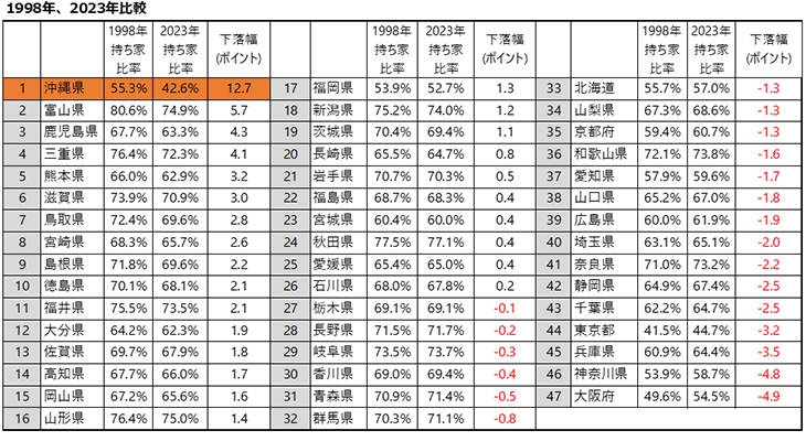 上の表は、2023年と1998年(25年前)の都道府県別の持ち家比率を比較したものを、持ち家比率の減りが大きい順に並べたものです。持ち家比率が減少した県は26、増えた都道府県が21となっています。