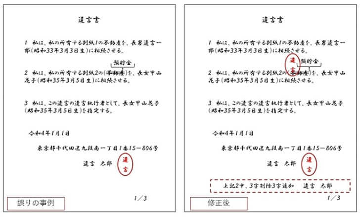 上図、左の事例では、書き間違った箇所が訂正されているのにもかかわらず、訂正した旨の記載や、訂正又は追加した箇所への押印が漏れています。