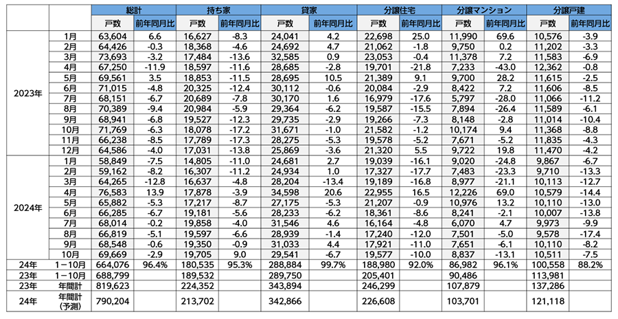 住宅関連の市況を色濃く反映する新設住宅著工戸數の動向を見ておきます?2024年の新設住宅著工戸數は執(zhí)筆時12月17日において10月分まで公表されており?11?12月分は発表されていませんが?1-10月の10か月分のデータを基に(このペースが続くものとして)年間合計の予測をすると?新設住宅著工戸數の総數は79萬戸程度になる見通しです?リーマンショック後の2009年以來の80萬戸以下となりそうな様子です?昨年2023年の年間合計は81萬9623戸でしたので?これよりも5%弱少なくなりそうです?