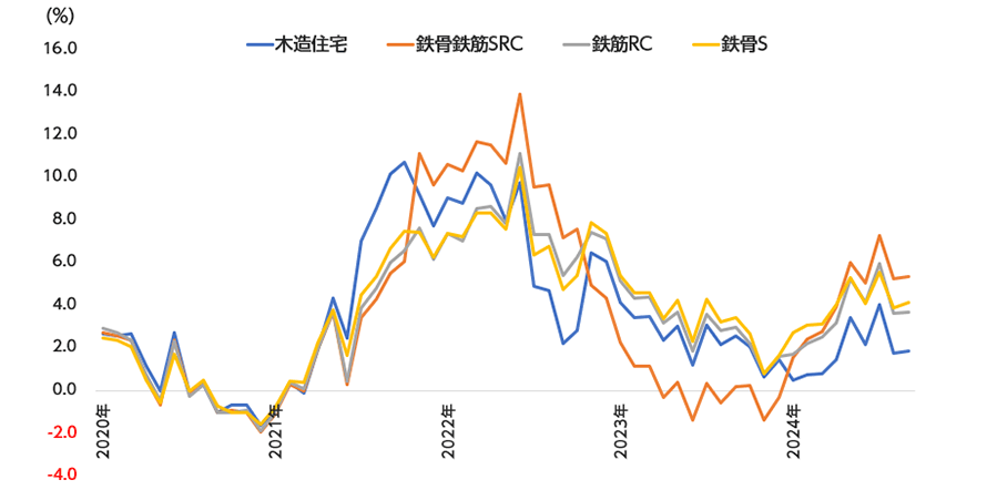 図2:建設工事費デフレーター:建て方別前年同月比の推移(2020年1月~)