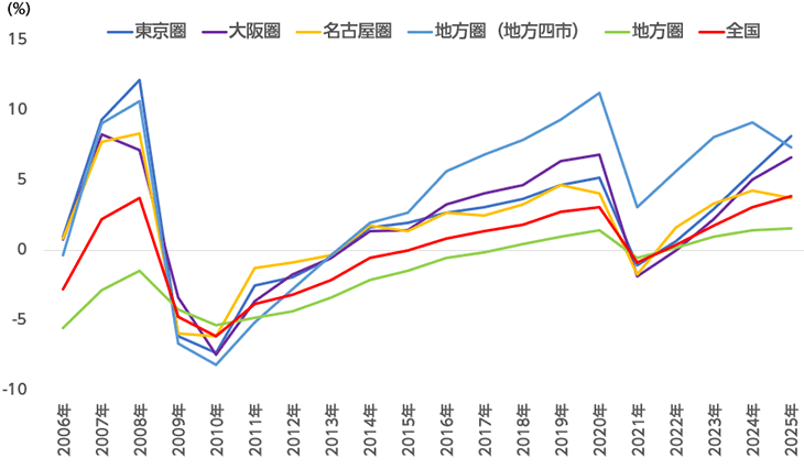 図2は2006年以降の商業地地価の変動率を圏域別に見たものです。
