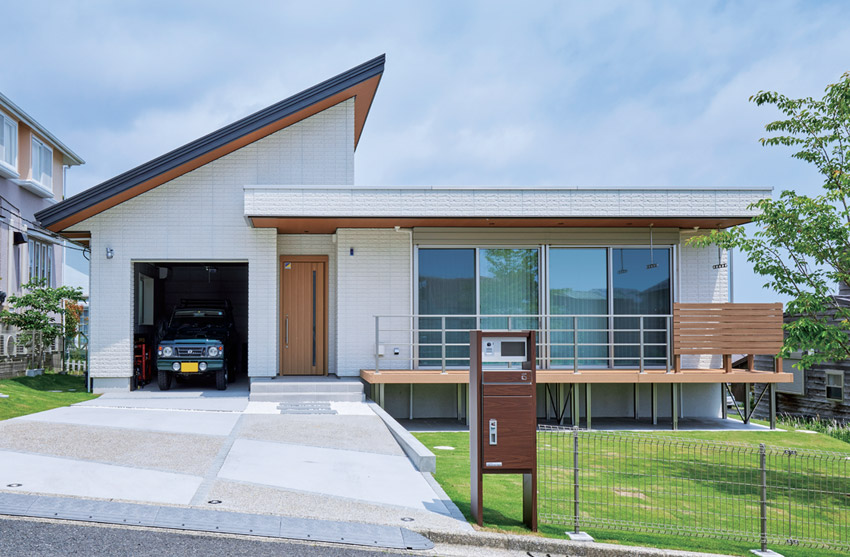 敷地の高低差を生かし、ウッドデッキや奧につながるリビングを少し浮かせた設計に。片流れの屋根がシャープな印象を、白い化粧砂利や洗い出しで仕上げたアプローチが上品な雰囲気を添えています。