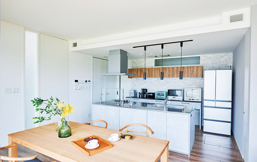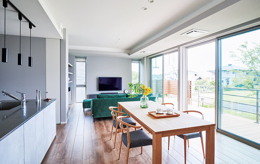 LDKは一続きにレイアウトし、廊下を挾んでプライベートスペースと分けた間取りです。妻の佳代子さんが中心になり、インテリアコーディネーターと相談しながら、Tさま邸らしいナチュラルモダンなインテリアをつくり上げました?!弗猊攻哎戛`ンの張地のソファに決めるのは勇気がいりましたが、とてもこの家に映えて気に入っています」と佳代子さん。南側には幅約5mの掃き出し窓が広がり、開放感いっぱいです。