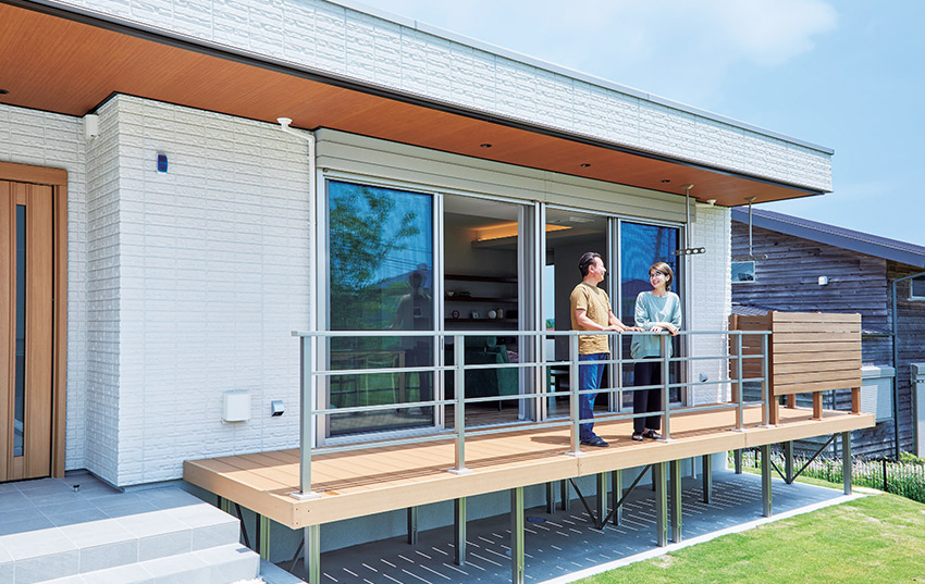 広いウッドデッキで語り合うご夫妻。この家に暮らし始めてから、やりたいことが次々と浮かんでくるのだとか
