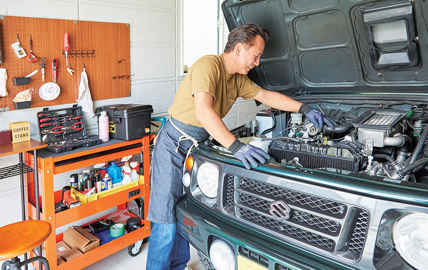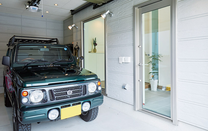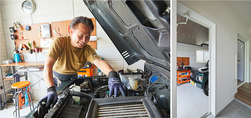 車が好きな夫の朋仁さんはビルトインガレージにこだわり、遊び心いっぱいの趣味の空間に仕上げました。四駆の軽自動車を自らの手でアレンジして楽しんでいるそうです。ガレージ內でテレワークもできるようにデスクを置き、エアコンも完備する念の入れようです。