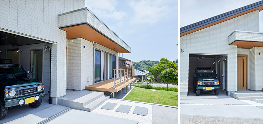 ビルトインガレージで過ごす時間は朋仁さんの寶もの。玄関ホールを通るたびに愛車の姿を見ることができるのも大きなポイントの一つです。