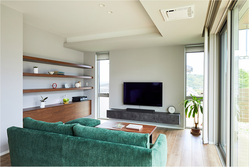 グレイッシュな色味のフローリングと、モスグリーンのソファが映えるリビング空間。天井は窓側を少し下げて変化をつけました。テレビボードの両側には2つの縦長窓をシンメトリックに配置しており、テレビを見ている時も開放感を得られます。気密性?斷熱性の高い構造に加え、全館空調によって室內の溫度差が小さい快適な住まいになりました。
