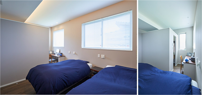 主寢室は落ち著いて眠れるよう、グレーのクロスやブルーのファブリックでコーディネート。間接照明の柔らかい光や北側の安定した自然光により、心地良く過ごせます。部屋の奧には造作のデスクと、ご夫妻共用のウォークインクローゼットが。クローゼットの壁の上部を開放しているのは、圧迫感がないようにするための工夫です。