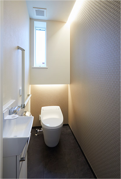 トイレにはコーニス照明(間接照明)を採用し、リラックスできる空間に。凹凸感のあるアクセントクロスを柔らかな光が照らし、美しい陰影を浮かび上がらせます。