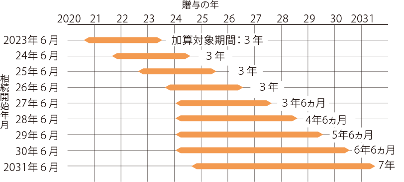 今回の稅制改正で、「暦年課稅制度の生前贈與加算」の対象期間が、相続開始前の3年以內から7年以內に延長されました。いきなり7年に加算されるのではなく、順次増加していきます。4年以上の生前贈與加算が始まるのは2028年1月1日以降、7年分の加算が開始されるのは2031年1月1日以降の相続です。