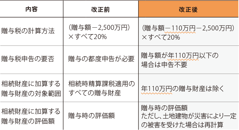 「相続時精算課稅制度」とは、原則60歳以上の祖父母や父母から18歳以上の子?孫に生前贈與をする際、贈與者ごとに選択できる制度です。同一人物からの生前贈與額が合計2,500萬円まで贈與稅がかからず、超えた部分は稅率20%が課されます。一度選択すると以降は同一人物からの贈與はすべて対象となり、贈與された財産に対して相続時に相続稅が課されます。今回の稅制改正により110萬円の基礎控除が設けられ、110萬円以下の贈與は相続時精算課稅制度を選択していても贈與稅申告が不要になり、相続財産にも加算する必要がなくなりました。
