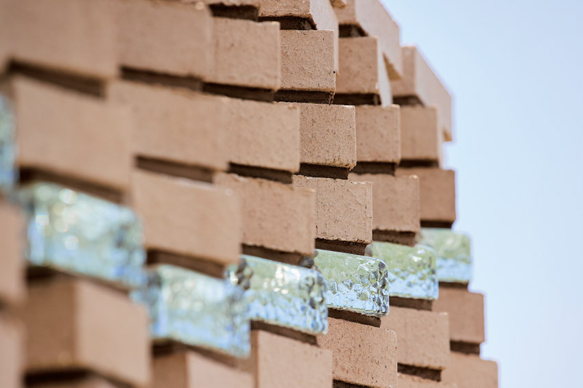 ねじりながらダブルで積んでいくスパイラルウォールが、街の顔となる場所に。目地にも地元産の砂が使われています