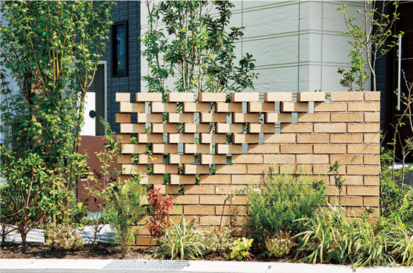 左:コーナーウォールは透かし積みの手法で軽やかに。視認性を高めることで交通の危険性を回避する配慮をしています