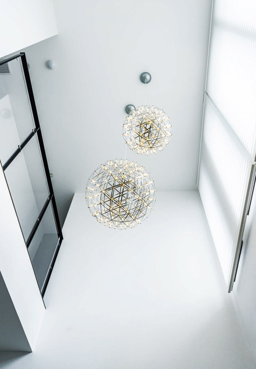 內と外、1階と2階をつなぐ東側吹き抜けに迫力のある照明がほしいと、ご夫妻自身で商品を探されました。そして選ばれたのがトーヨーキッチンの「レイモンド」。球體に組み上げたステンレスとLED光源で構成した、美しさと機能性を兼ね備えた照明です。大きさの異なる2燈をバランスよく配し、下から見上げても2階ホールから見ても印象的な空間をつくりました。