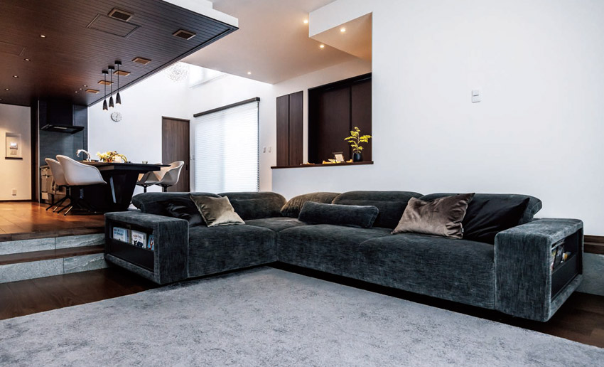 ロースタイルリビングには、座面の広いL字型のローソファを採用いただきました。座面に奧行きがあるデザインや柔らかな張地によって、リラックスして體をあずけることができます。左右の側面にリビングで使う絵本などを入れておく収納が付いているのも便利なポイントです。奏汰くんと緋茉梨ちゃんは、ここに座って遊ぶことが多いのだそうです。