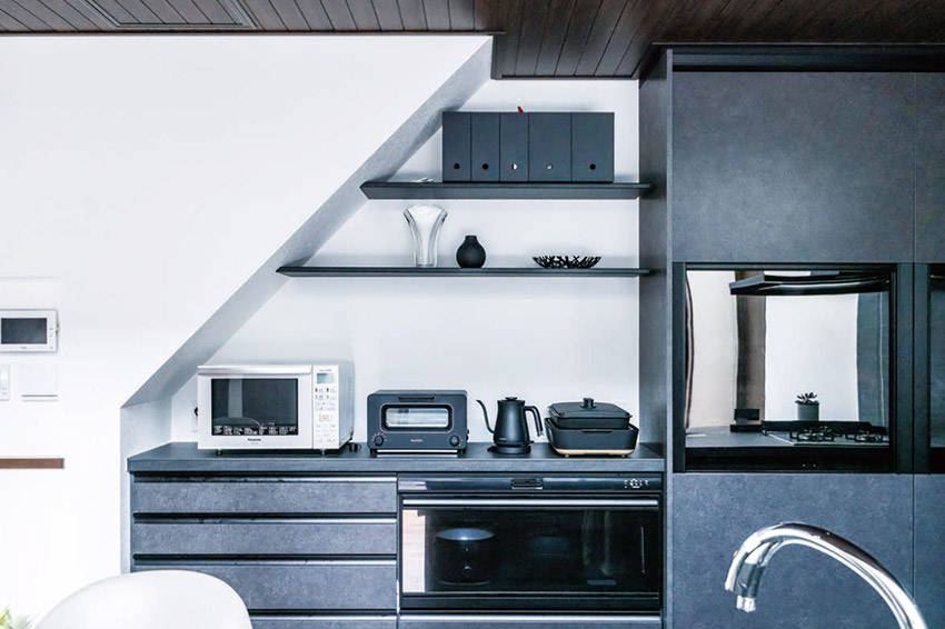 背面の飾り棚は、階段下の斜めの白壁を生かしたアシンメトリーなデザイン。キッチン面材と合わせたグレーをベースに、カウンターとカップボードを選びました。カップボードの扉は左右に開閉して中身をすっきり隠せます。よく使う物は上下に開く小窓からも出し入れできます。