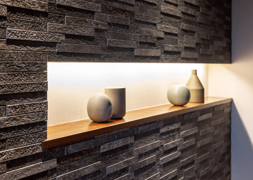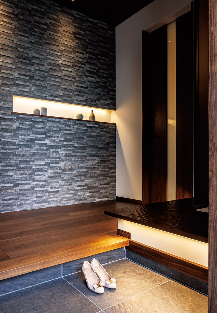 玄関ホール正面の壁にはグレーのアクセントタイルを張り、ニッチを設けました。壁の陰影を強調するダウンライトやニッチ內の間接照明などが、わが家の顔となる壁面を印象的に演出します。また、2階廊下のニッチは、本棚として活用されています。