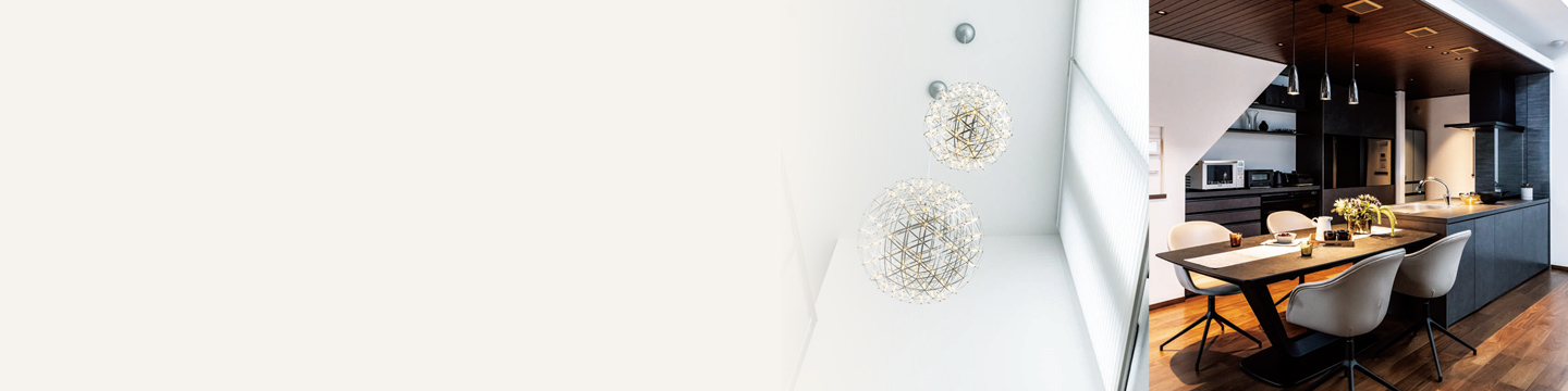 吹き抜けの開放感とは対照的に、ダイニング?キッチンはダークトーンのしっとりとした空間に。天井を少し落として木調パネルを張り、3燈のペンダントライトをあしらいました。ダイニングテーブルは、ボーコンセプトから選んだ伸長式タイプ。使い勝手の良い回転式のチェアとともにご提案し、お選びいただきました。