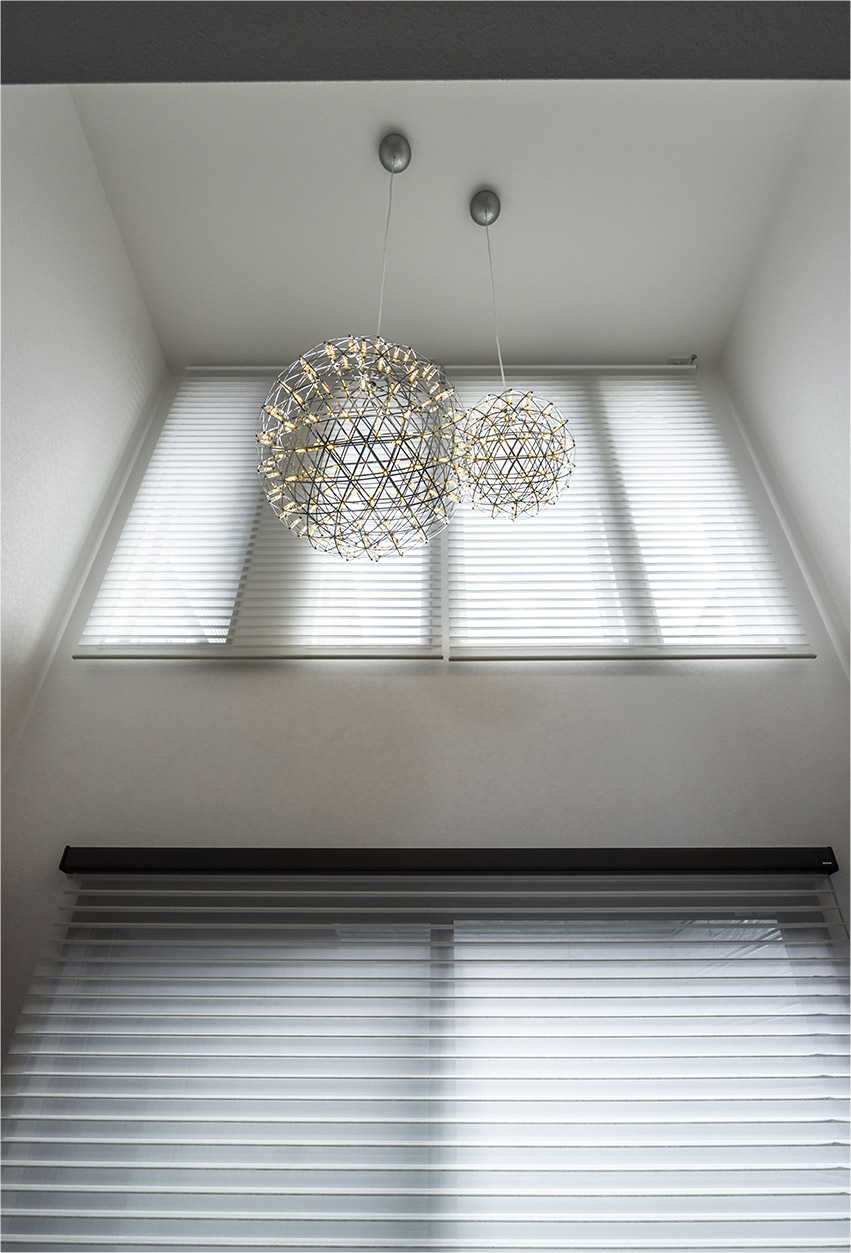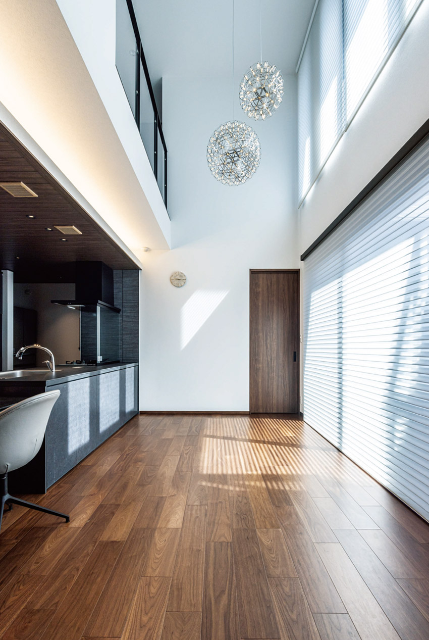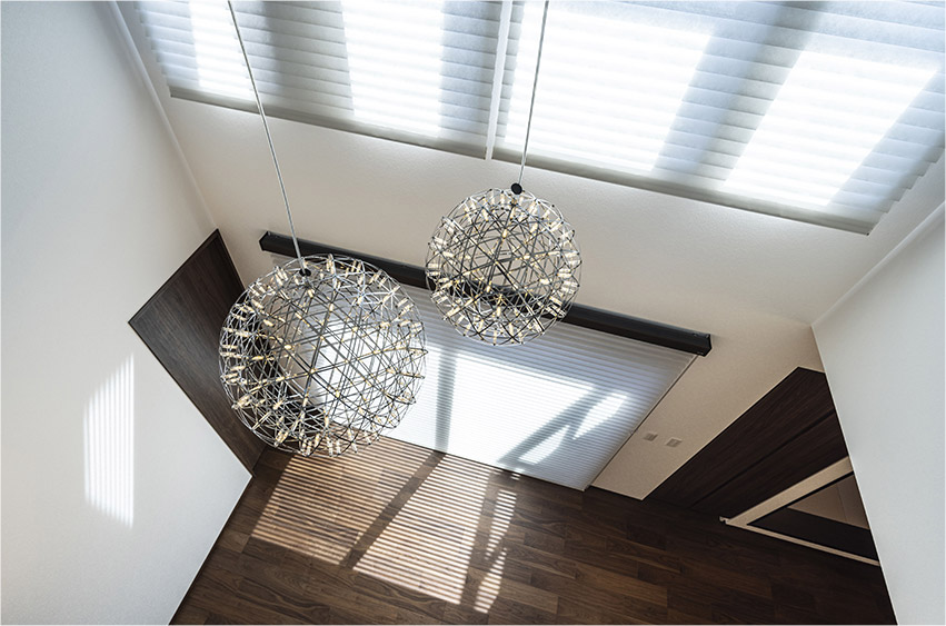 その吹き抜けの天井を飾るのは、2燈の球形のシャンデリア。ブラインド越しに訪れる自然光やキッチン側の間接照明と相まって空間を華やかに彩っています。「この照明をリビング側(寫真手前)から見るのが好きなんです」と夫の雅能(まさよし)さん。ご夫妻自身が惚れ込んで選んだデザインを、満足そうに眺めていらっしゃいます。