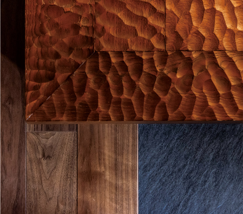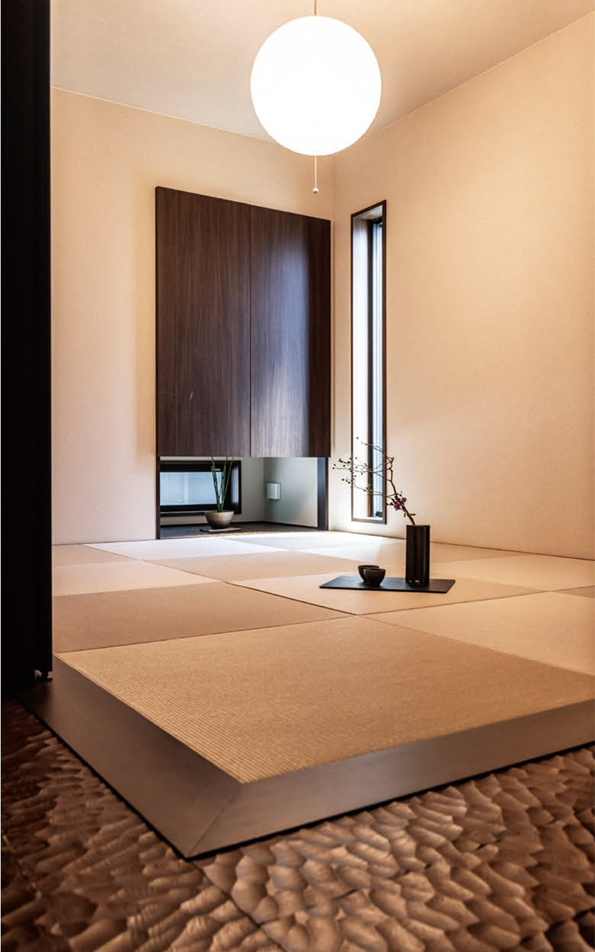 玄関ホールとリビングから出入りできる和室。玄関側には質感豊かなスプーンカットの床板が用いられています