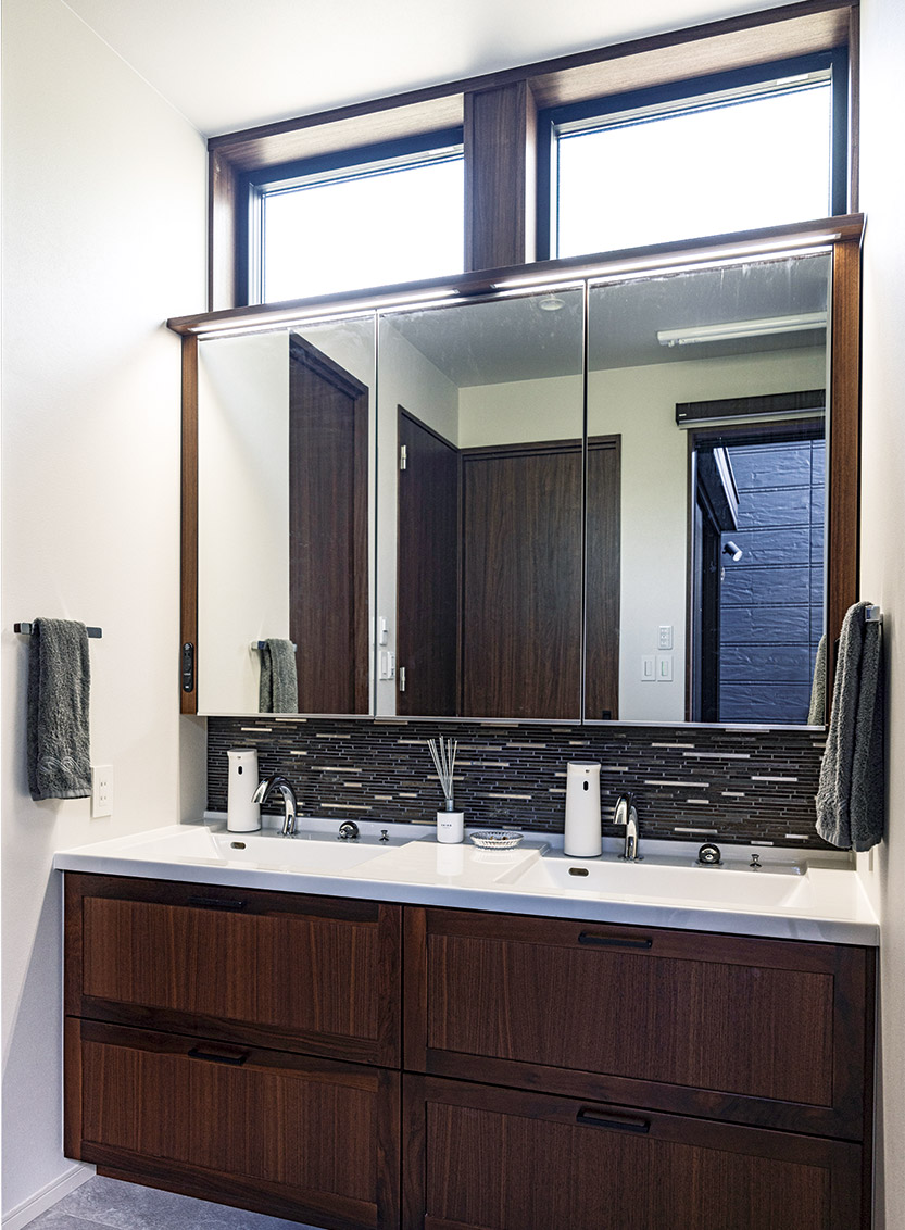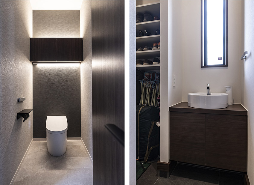 Aさま邸は水まわりにもきめ細かなこだわりが光ります。子どもたちのトイレトレーニングをサポートするため、トイレは広めに設計。間接照明の柔らかい光を組み合わせた心地良い空間です。また、玄関収納の橫には手洗いカウンターを設置。外から帰ったらすぐ手を洗う衛生習慣が身につきます。